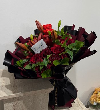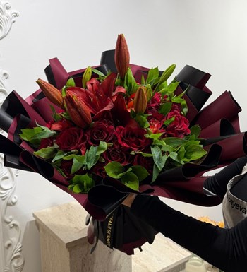 Deluxe Bordo Lilyumlu Kırmızı Güllü Buket