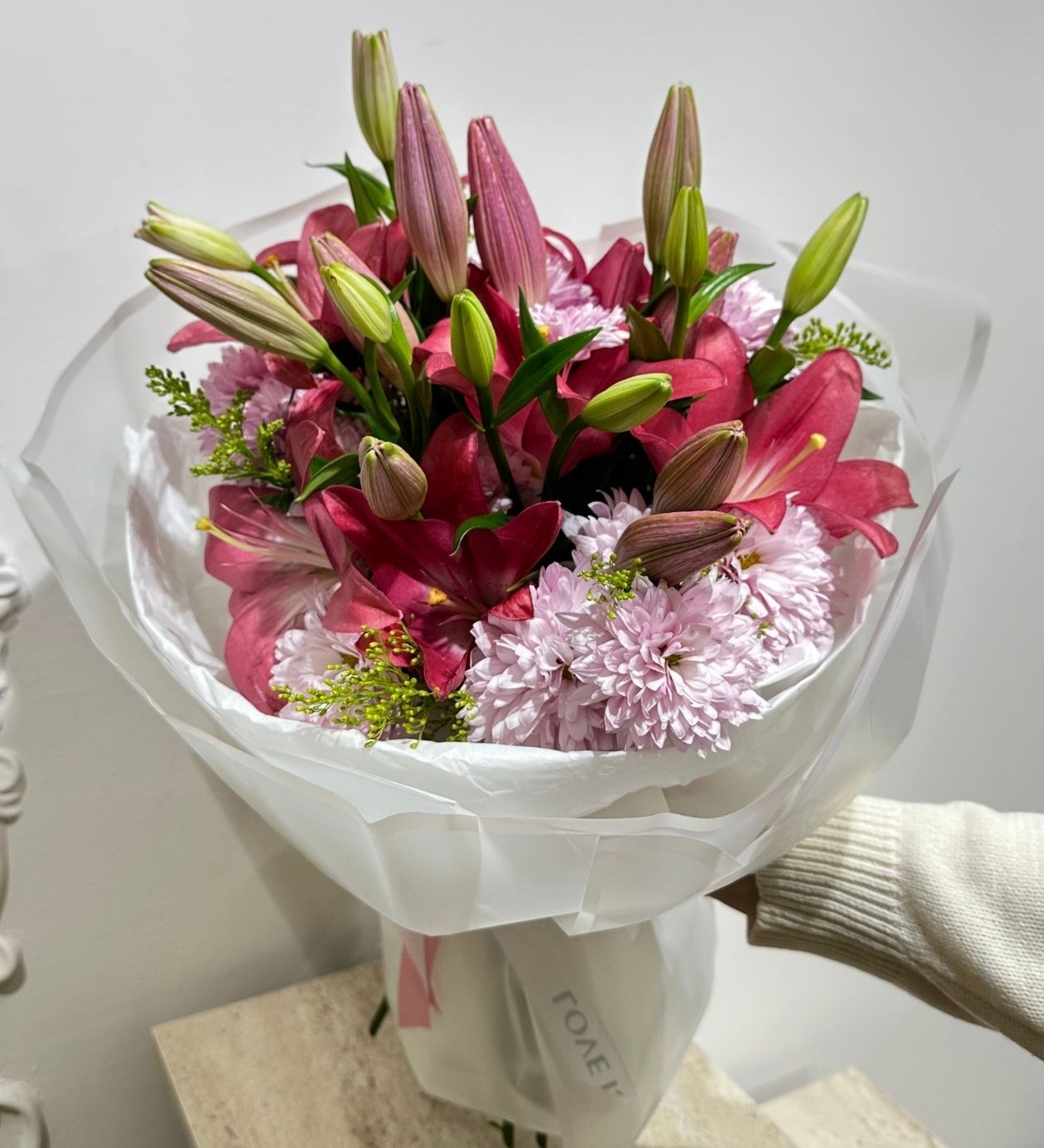 Pembe Lilyum ve Krizentemli Buket
